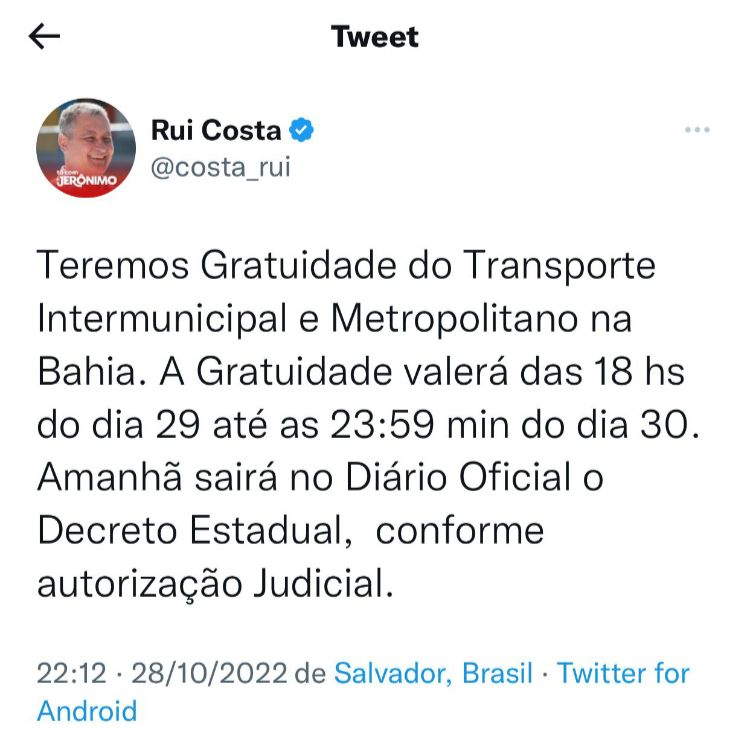 O governador Rui Costa (PT), publicou o decreto de número 21.706 de 28 de outubro de 2022, que assegura o uso gratuito do transporte intermunicipal e metropolitano a partir das 18h deste sábado (29) e vai até às 23h59 do domingo (30).